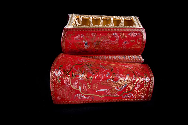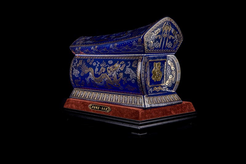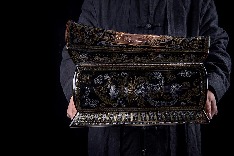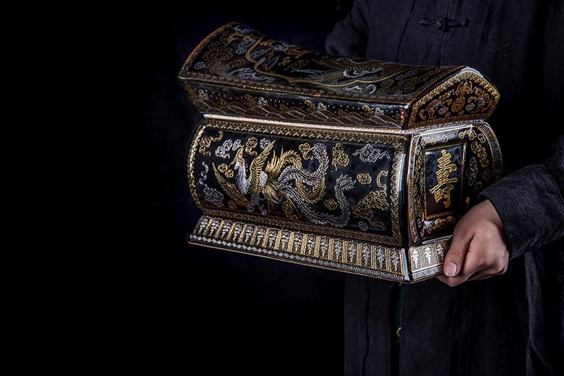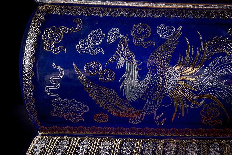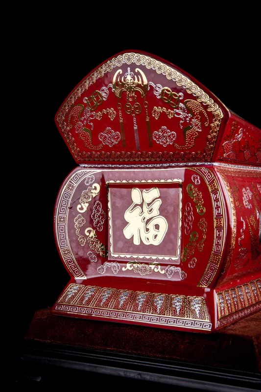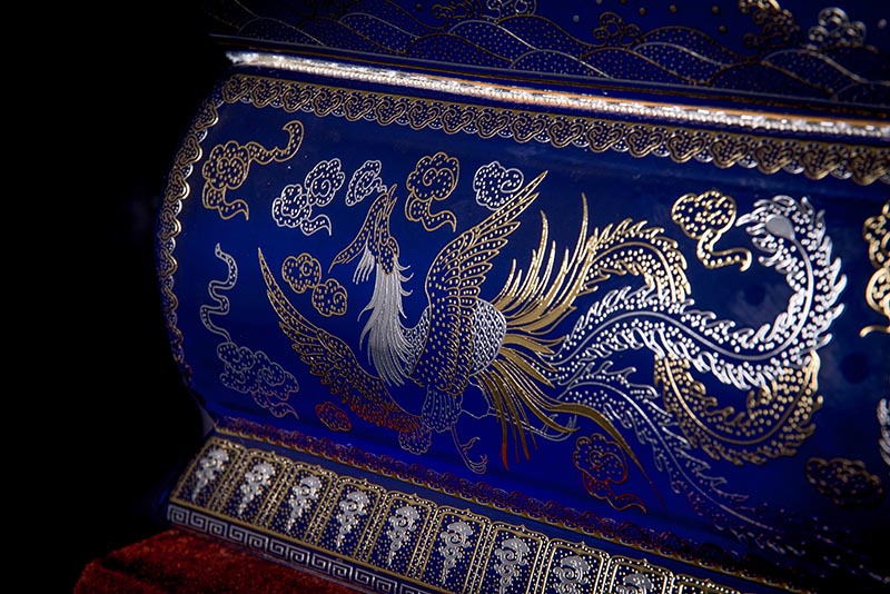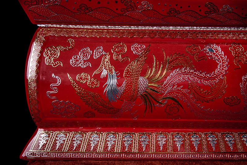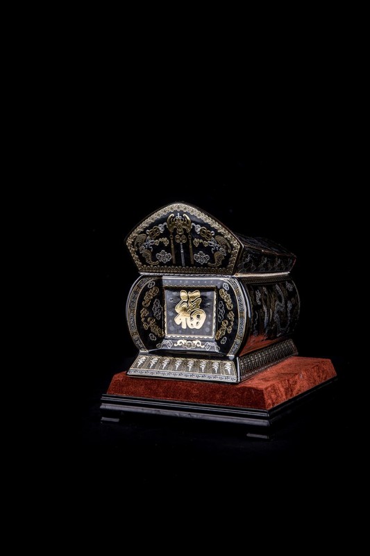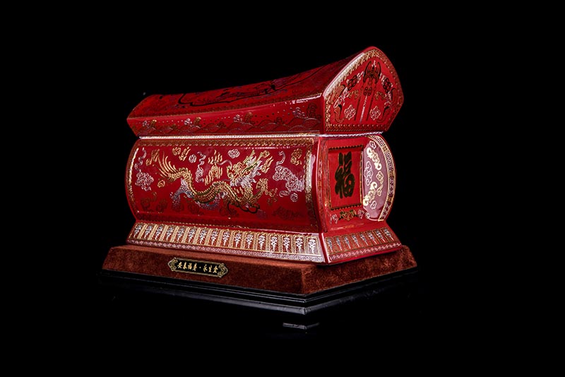 這款【金銀龍鳳】系列產(chǎn)品器型是傳統(tǒng)的長(zhǎng)棺造型,古人常說:見棺者,升官發(fā)財(cái),可見它的美好寓意。我們可以看到這款產(chǎn)品,一面龍,一面鳳,素有“龍鳳呈祥”一說,采用的是“錯(cuò)金銀”工藝,它是中國(guó)非物質(zhì)文化遺產(chǎn)名錄的一項(xiàng)美麗的藝術(shù),源自于“春秋戰(zhàn)國(guó)時(shí)期”至今已經(jīng)2000多年,把這種精湛工藝運(yùn)用到我們永生盒,既是傳承,亦是發(fā)揚(yáng)!尺寸:400x220x290mm