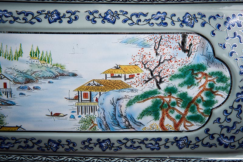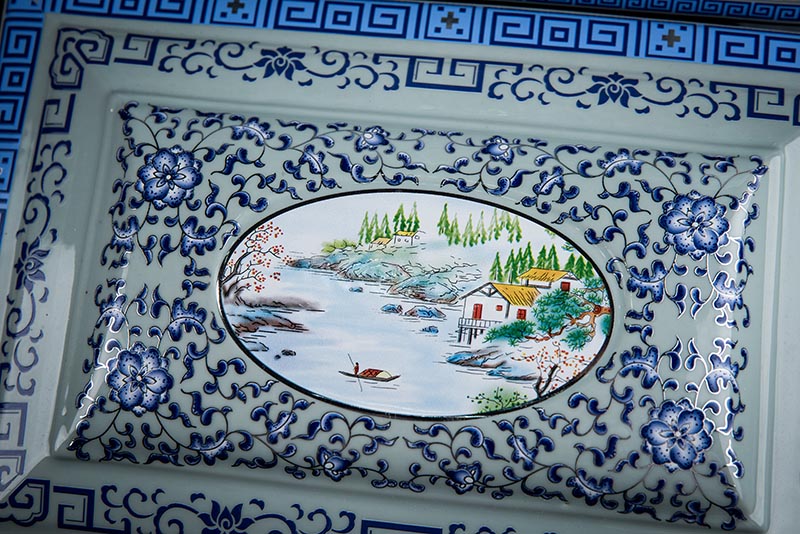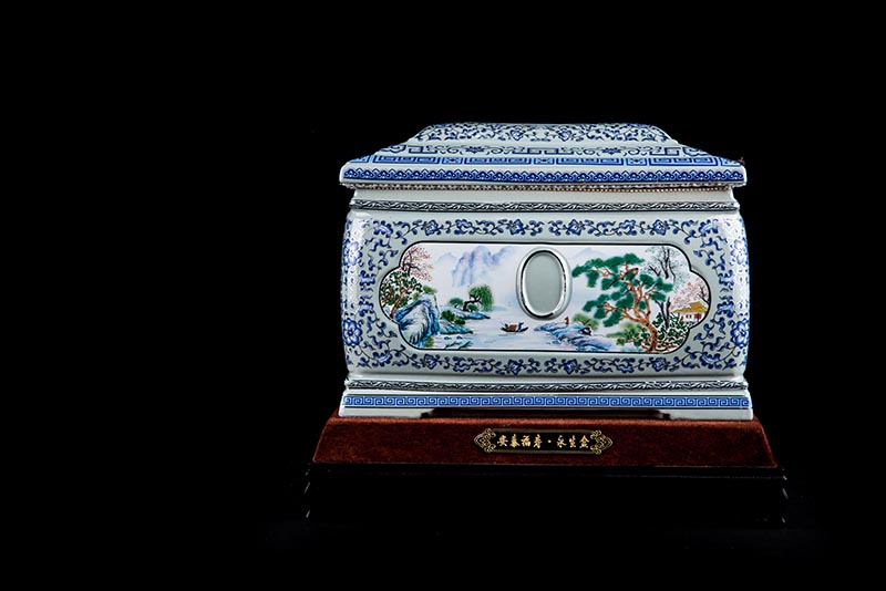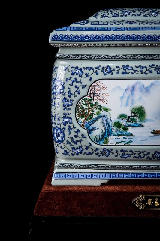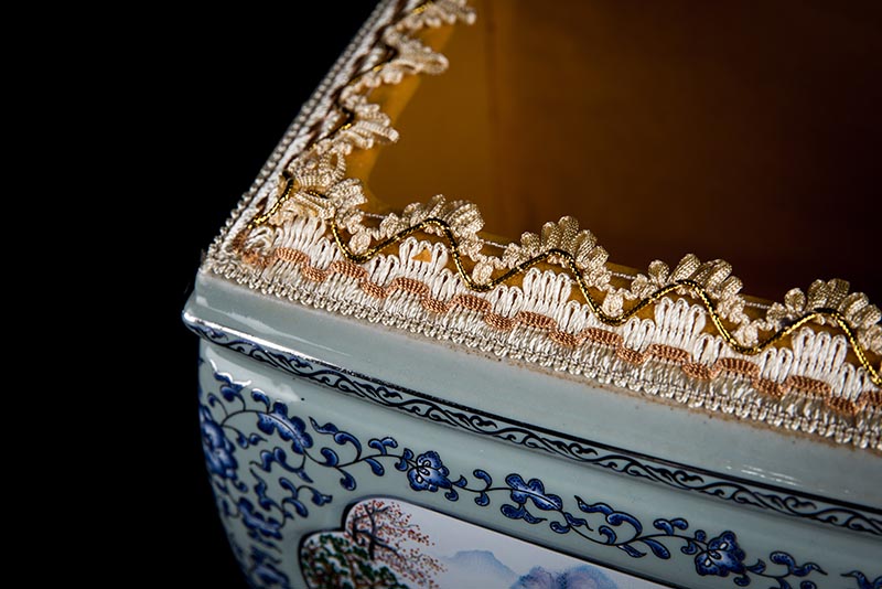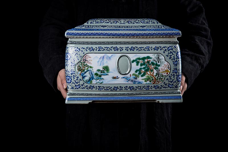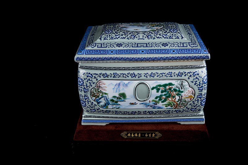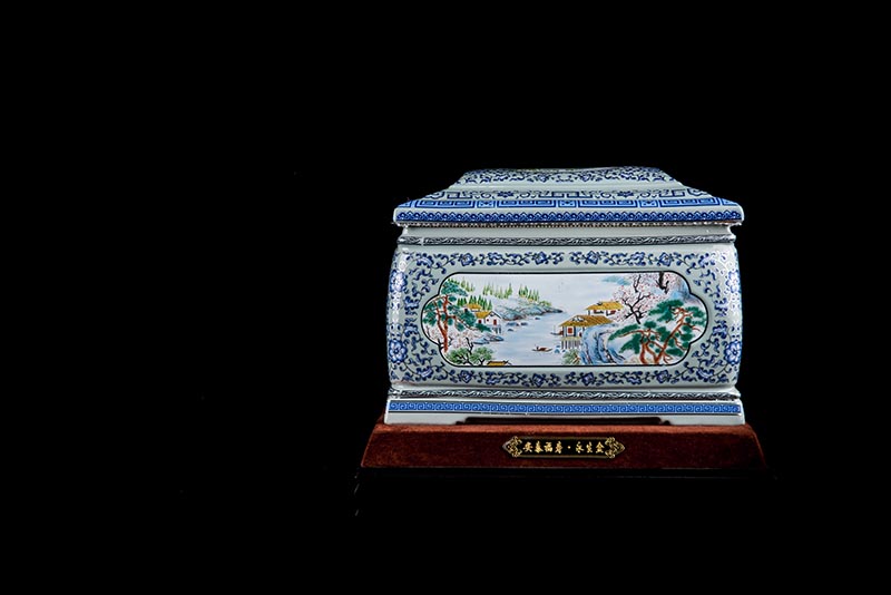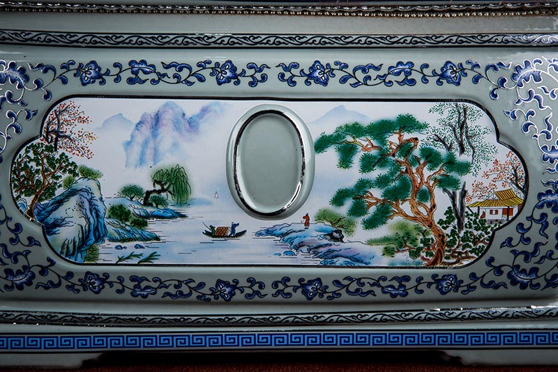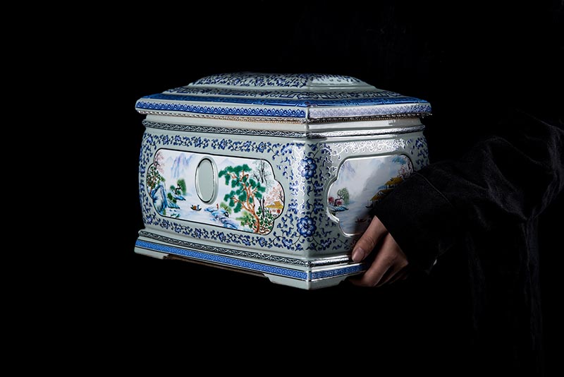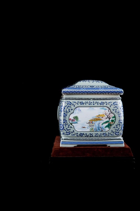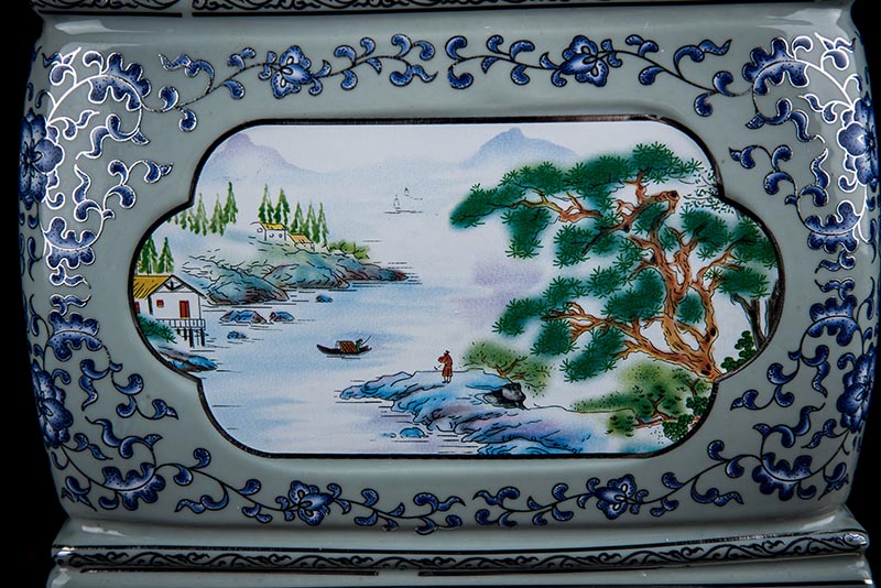 這款產(chǎn)品采用了青花粉彩工藝,既有景德鎮(zhèn)具特色的青花,又有山水,景德鎮(zhèn)民間稱之為“開(kāi)窗山水”很多工藝品都會(huì)運(yùn)用上,讓許多文人墨客忍不住注目觀看。我們可以看到這款產(chǎn)品圖片上青花與山水搭配巧妙,纏枝蓮紋環(huán)環(huán)相扣,寓意后世枝繁葉茂,代代繁榮。尺寸:340x230x250mm